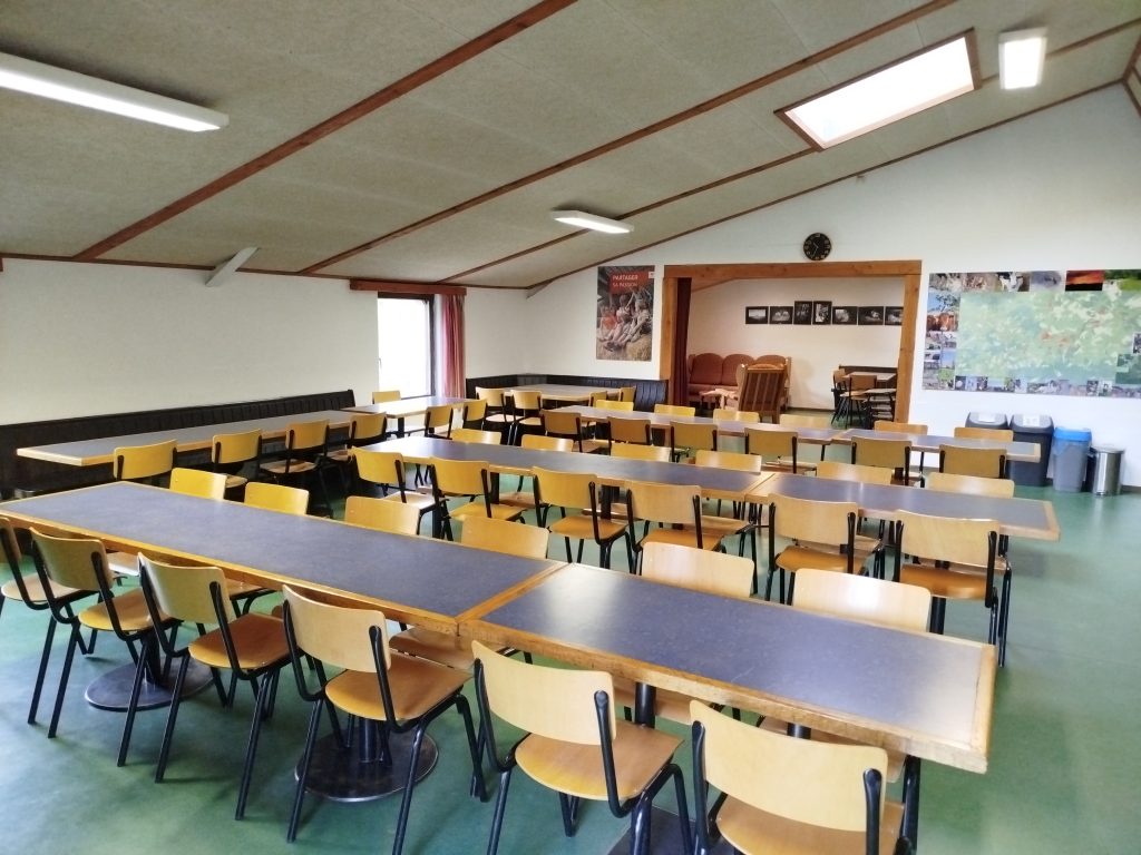 Vous avez accès au réfectoire et à la cuisine équipée (cuisine professionnelle pour la collectivité : chambre froide, cuisinière au gaz, four électrique lave-vaisselle, vaisselle et couverts pour 80 personnes, …), et à l’extérieur, à une terrasse et une plaine de jeux.